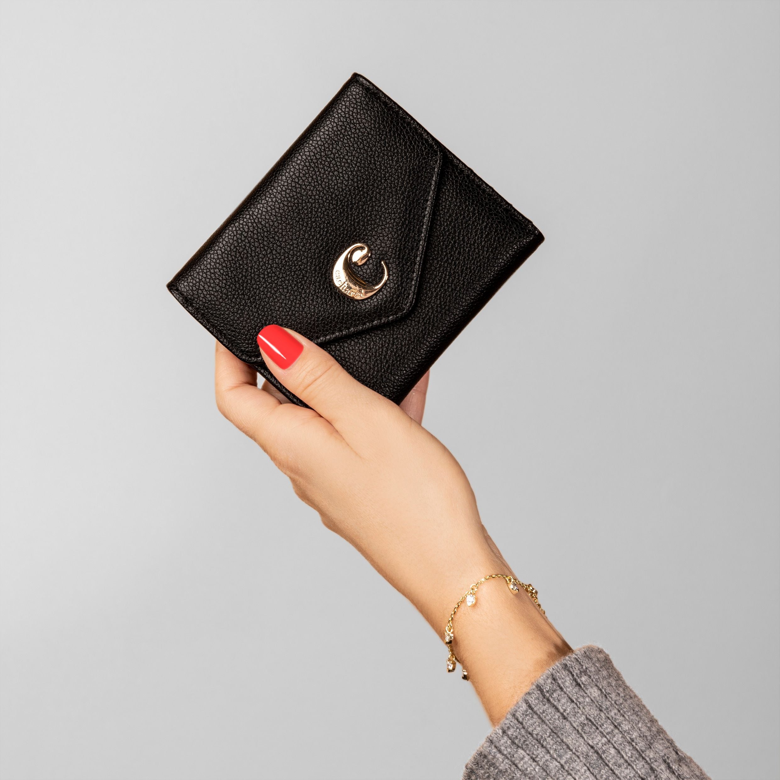 The cacharel "Alma" wallet are made of carefully chosen pebbled grain vegan leather (PU). The signature plate is a slightly oversized and domed version of the iconic "C" logo, signed with a Cacharel engraving. The wallet were designed to be both compact and roamy, with multiple compartements to best organised all your essentials : multiple card slots, a coin pouch and 2 note compartments. They come in an array of beautiful colors, and are perfect to match with the eponymous bags. Dimensions: 115 x 20 x 95 mm, Material: Polyurethane