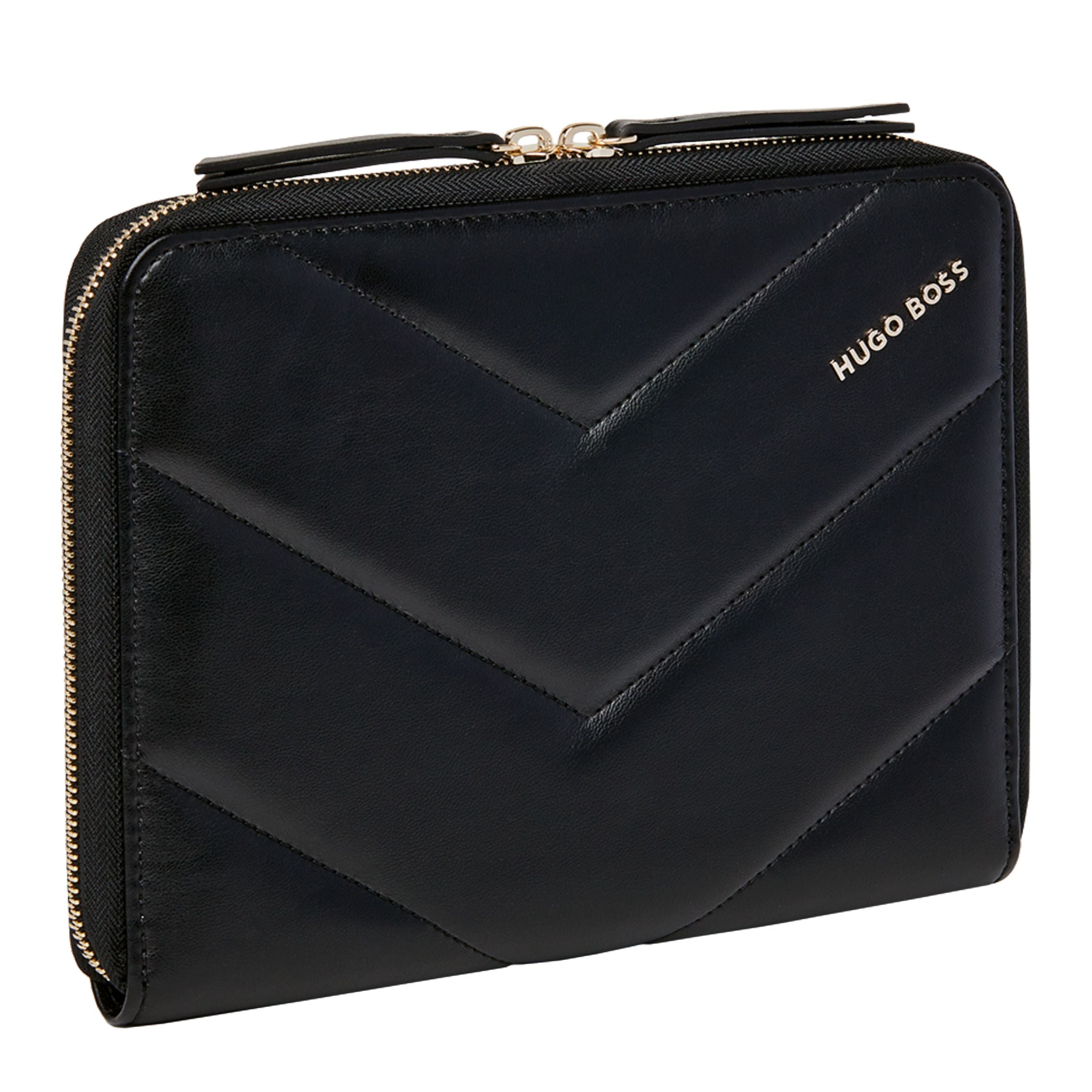 The feminine & sleek Triga folders are enhanced by luxe golden accents and mate vegan leather textures. They are signed by a beautiful golden HUGO BOSS logo plate, and their surface is quilted with a geometrical & graphical pattern, making it both modern & feminine. This A5 folder is available in 3 luxurious and warm tones : Black, Beige or Taupe. It willl be the perfect everyday companion, allowing to take notes on its paper pad, but also featuring a roamy interior to organise all your documents. The "Triga" line is perfect to mix & match in combinations that suit your taste, to create understated yet refined gift sets. Dimensions: 225 x 180 x 25 mm, Material: Polyurethane
