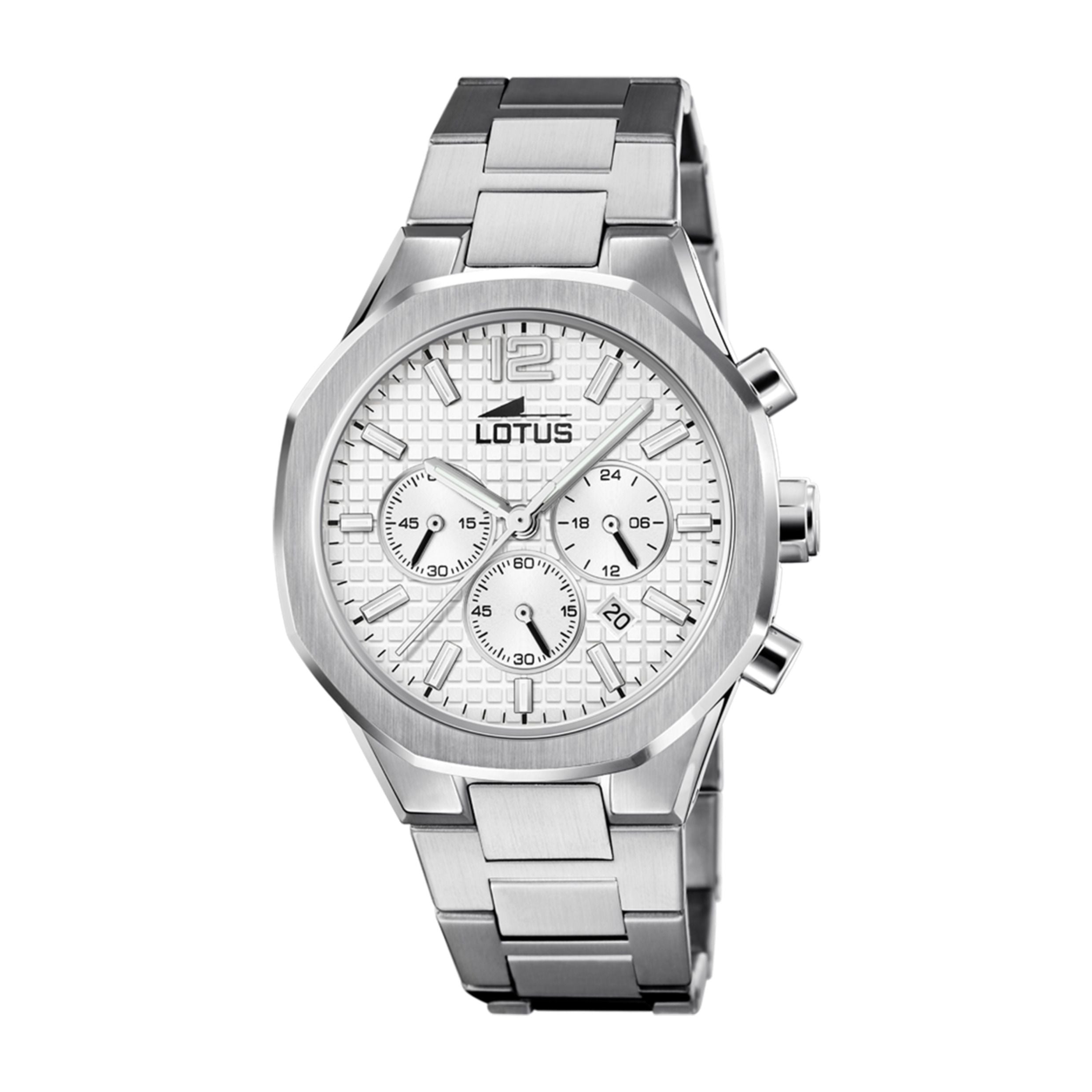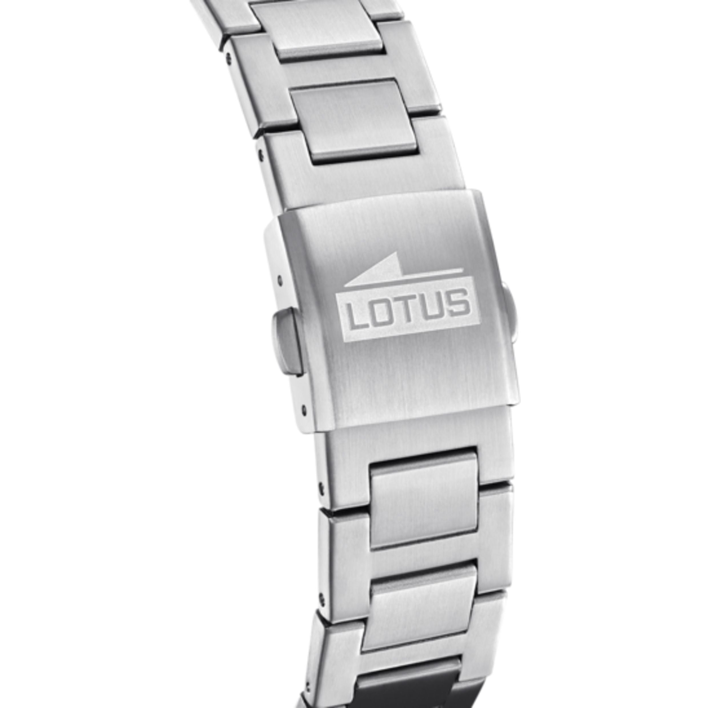 Montre homme Lotus avec boîtier en acier inoxydable 316L, verre minéral et bracelet en acier inoxydable 316L. Les montres Lotus proposent des designs exclusifs et novateurs pour une clientèle contemporaine, urbaine et moderne. Dimensions : diamètre 41,8 mm / longueur du bracelet : 217 mm. Matériau : acier inoxydable.