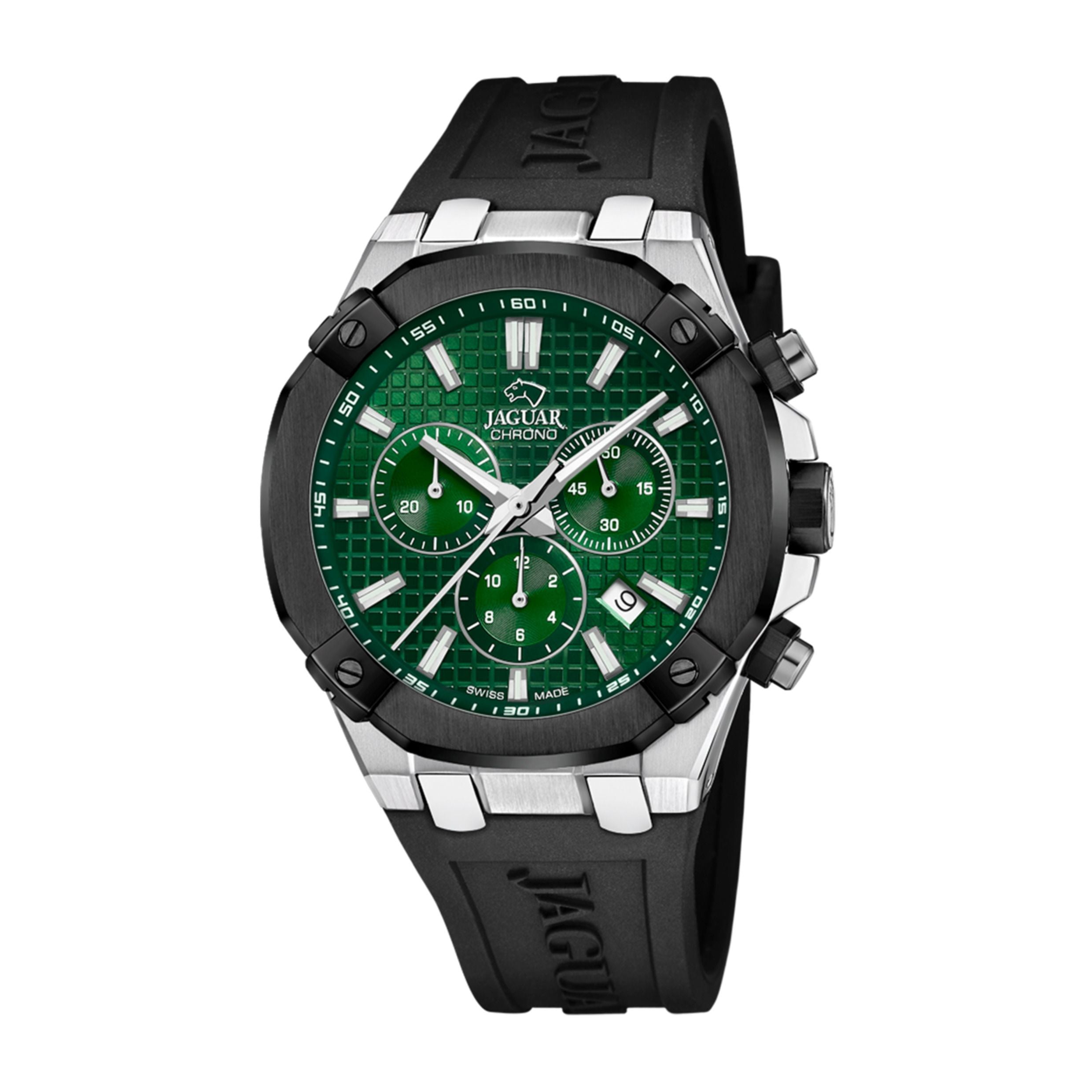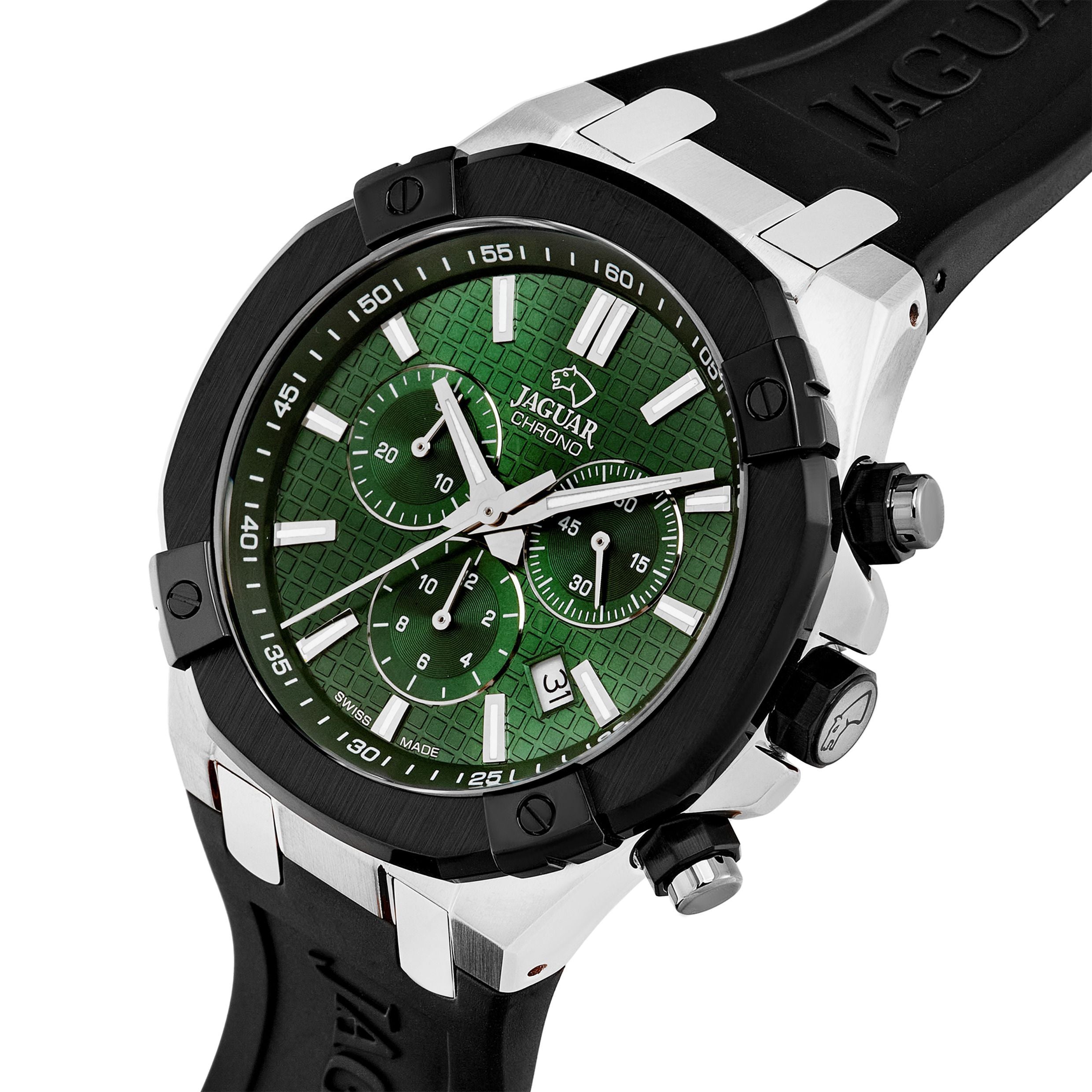 Men's Swiss JAGUAR watch, from the DIPLOMATIC collection. The model , in Green color, with a green dial and silver indices, offers perfect readability thanks to its sapphire crystal.The choice of a sapphire crystal ensures exceptional visibility of the watch and gives it tremendous resistance to scratches. Due to its characteristics, sapphire crystal is exceptionally hard. Only diamond offers greater hardness than this material and is the material of choice for pieces that withstand the test of time while maintaining their beauty and good presence. Moreover, the crystal on this watch includes an anti-reflective treatment, greatly preventing the occurrence of uncomfortable reflections that hinder the correct reading of the dial under certain lighting conditions.